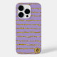Features a wavy, striped gold glitter pattern on a violet background. Personalise with an initial on a gold foil circle.
