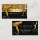 This chic and modern design combines rich black with stunning faux gold glitter textures for a truly glamorous look. The card features eye-catching illustrations of a gold glitter hair dryer and professional shears/scissors, making it instantly recognizable and perfect for the beauty industry.
