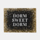 Cute Gold Glitter doormat with a black background and the saying Dorm Sweet Dorm - A fun decor gift for the new college student moving into a dorm room.