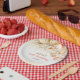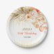 Elegant and stylish floral birthday paper plate features stunning watercolor yellowish orange flower with beige leafy greenery and long gold glitter rain garland. Perfect party supplies for flower themed birthday celebration.