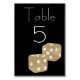 This glamourous custom table number card features a gold and black casino design. An image of large, gold glitter dice is printed across the centre over a black background. You can personalise the table card to include your own custom name or text.