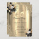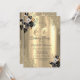 A modern, chic, and glamourous with gold glitter drips, and black roses on a gold background.