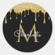 Gold Glitter Drips Monogram Elegant Girly Script Classic Round Sticker