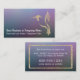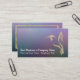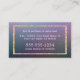 This business card features a simple and elegant hummingbird design. The background is shiny looking, dark holographic pattern, with rainbow iridescent colours. A hummingbird is pictured on featured the right with a sparkly gold glitter design. The company or business name is printed on the front, with the contact information printed on the back.