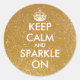 Faux gold glitter Keep calm and sparkle on stickers. Round Keep Calm and carry on stickers with glittery background texture. Customisable design with sparkly sparkles and shiny glittery glimmers. Vintage Keepcalmandcarryon typography template with crown. Create your own funny parody. Cute as golden wedding favour label or as envelope seals / sealers.