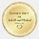 Gold Glitter creates a beautiful edge for this engagement party envelope seal sticker. Gold metallic and white form the inner circles. Engagement Party is written in an elegant font. The engaged couple's first names are written in a flowing script to make them really stand out. The party date is written below their names. A small open heart adds to the romance and completes the engagement party sticker.