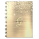 A trendy design of faux brushed gold metal background and gold glitter with gold monogram and black script name.