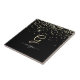 A trendy design of gold glitter with gold monogram and white script name on black background.