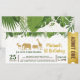 Swinging with all kinds of excitement with this Gold Safari Animal! This entrance ticket invitation design features an editable "calling all party animals" and gold glitter safari animal surrounded by tropical green forest leaves with admit one ticket in gold.