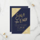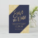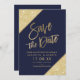Gold typography on customisable navy blue gold glitter colour block, and faux gold geometric stripes chic save the date wedding , perfect for elegant, stylish wedding,