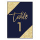 Gold typography on customisable navy blue gold glitter colour block, and faux gold geometric stripes chic table number wedding , perfect for elegant, beach wedding,