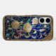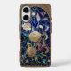 This is a beautiful Gold Glitter Stained Glass iPhone 16 Case. The design was created with generative art. The art features stained glass gold roses on a blue background with a gold glitter frame. You can add text or replace the image with one of your own with the Personalise button.