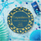Blue and gold school colours, gold graduation caps thrown in the air for both him and her. Nice graduation party paper plates for a grad party, for a graduate from a high school, college, or university with school colours of blue and gold. Personalise with graduation year, name of the graduate, and the name of the school.