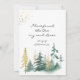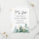 Inspirational wedding Save the Date depicts a rustic woodland watercolor design with elegant sparkling gold and green pine trees. The back features Bible Verse Song of Solomon 3:4, "I have found the One my soul Loves." Good choice for autumn, winter and Christmas.