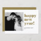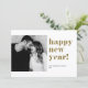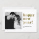 Happy New Year! Send holiday wishes to your loved ones with this customisable modern New Year flat card. It features gold bold typography. This gold and white New Year photo flat card is available in other colours and cardstock.