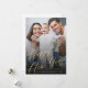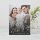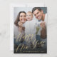 Simple stylish minimal trendy photo overlay chic faux gold calligraphy and snowflakes Happy New Year greeting card template personalised with your photo, and family name