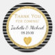 Elegant wedding stickers begin with black and white stripes to add an air of sophistication. Gold glitter frame adds glamour and a gold heart adds a romantic flair. Thank you for coming is written in gold. The bride and groom names are written in a pretty font, with their wedding date below. These chic and stylish wedding stickers will look great as wedding decor embellishments, party favour seals, wedding cake box seals or on thank you notes.