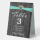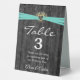 Aqua ribbon in heart with baby's breath bouquet on rustic dark grey barn wood for table number tent.