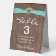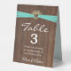 Aqua ribbon in heart with baby's breath bouquet on rustic brown barn wood for table number tent.