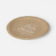 Gold hearts are scattered around your personalised details set in elegant text on a rustic kraft boho background on this chic gender neutral baby shower, sprinkle or couples shower paper plate.