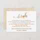Offer your guests handy cards to help them remember your wedding details and stay in the loop as plans unfold with this distinctive, festive card. A striking text overlay reading "details" was designed using a modern, script font that has been embellished with hearts and overlaid with a faux gold foil effect. Use the template fields to customise these enclosure cards with your personal details. The background is an editable white you may change to any other colour you prefer. Please don't hesitate to reach out if you have special requests. Other sizes are available. // 80 //