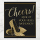Gold high heel shoe wine bottle labels with pretty gold glitter high heel shoes on an elegant black and gold background with elegant gold script Cheers. You can easily customise these black and gold wine bottle labels for your event by simply adding the text of your choice.