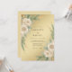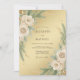 A shimmering gold backdrop provides a luxurious foundation for this seasonal design. Delicate cream roses are artfully arranged with wintry sage green pine needles and cedar branches to create a sophisticated botanical aesthetic. This metallic palette blends warmth with soft floral elements for a formal and opulent atmosphere.