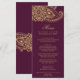 This gold Indian paisley dinner menu card is perfect for an elegant wedding. The mehndi design features a lovely floral henna mandala and paisley motif on a burgundy background. This menu can be used for a wedding reception, rehearsal dinner, or any event.