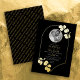 A wedding invitation with a beautiful design inspired by gold jewellery, featuring a frame with leaves and your picture. This modern invitation elegantly displays your custom message and photo within a gold border that curves at the top and it is pointed at the bottom, with branches and leaves set against a black background. To add a unique touch, the names of the couple are presented in gold on a black background in a slanted arrangement on the back. The cover has been designed using assets from Freepik.com