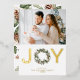 Gold Joy Foil Holiday Card. This winter gold foil joy holiday card features hand-painted watercolor greenery and pinecones arranged as a beautiful wreath with a family photo. The back includes a matching pattern. Find matching items in the Pinecone and Greenery Christmas Holiday collection.