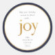 May your holiday season be filled with joy. Golden faux foil joy lettering and round faux foil frame with dark navy blue border, holiday sticker.