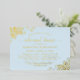 This beautiful rehearsal dinner invitation features an elegant design with gold foil printing on a pale powder blue coloured background. The design features fancy script calligraphy with golden lace curls and swirls in the corners. There is space for information on both the wedding rehearsal and the dinner. Wonderful way to thank the bridal party while making sure they have all of the info they need.