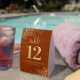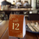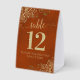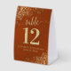 These beautiful table tent signs will make it easy for your guests to find their tables at your wedding reception. The elegant rust orange or burnt umber and gold design features lacy script calligraphy with ornate floral curls and swirls in the corners. There is space for the names of the couple and the wedding date.