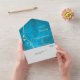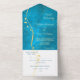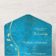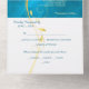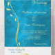 This pretty all season wedding invitation with tear away RSVP card in tones of gold and teal blue will give a sense of elegance to your wedding! The inside has a graceful gold swirl adorned with a few leaves, and there's a subtle gold confetti overlay to add a bit of sparkle. Your wedding text is in pale gold at the right of the leaf swirl image. Everything is placed on a stunning teal blue gradient background that seems to almost glow. The bottom tear away RSVP portion has the swirl image continued, but is white to make it easy for your respondent to mark. If you don't need a text field, just blank it out, and if you need help organising different text, please contact us. We are always happy to help. If you're having a buffet reception, we can work with you to re-design the RSVP portion, so don't hesitate to ask! An added bonus and personal touch is your own photograph on the back flap.
