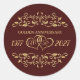 50th Wedding Anniversary Sticker with elegant golden leafy swirls and joined golden hearts set against a burgundy background. The background colour can be changed.