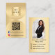 A faux gold looking background. Personalise and add your business logo,photo, name, title and contact information. Add your website url/link to the Qr code. With Facebook and Instagram icons. Black text.