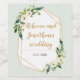 A gold foil look geometric frame with greenery and white floral watercolor bouquet corners is set against a light aqua background on this wine bottle label. Adds an elegant look for a wedding, bridal shower, engagement party, birthday party or any other floral-themed celebration. Available with matching products.