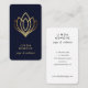 Elegant business cards for yoga theacher, massage studios, massage therapy, spas or wellness professionals feature a faux gold foil lotus flower logo illustration . Customise the front with two lines of custom text on trendy navy blue background, and add your full contact details to the back using the template.