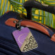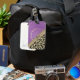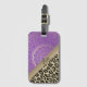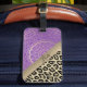 On this stylish luggage tag is an elaborate gold lotus mandala on a purple background with a gold ribbon where you can personalise it to make it uniquely your own then below that is a faux fur brown and black leopard print for contrast. Elegant exotic vibes.