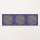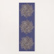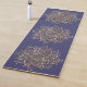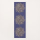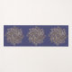 This yoga mat features an elegant pattern of three large gold mandalas on a navy blue background.