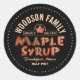 This label is not for the faint of heart. Bold, dark, and rustic, it draws up the image of a hot pot of sap being boiled down on an old woodstove in a shed. The orange maple leaf emblem shows the grade while maple syrup is written in a rustic decorative font, and the fonts are in a pale amber and maple-syrup coloured text. Edit this casual maple syrup label by adding your business name, address, volume of maple syrup and grade.