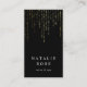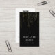 Simple and elegant vertical business card design features classic white lettering on a rich black background with cascades of faux gold foil string lights at the top. Personalise with two lines of custom text on the front, and add your full contact information to the reverse side, along with a customisable QR code.