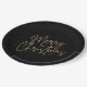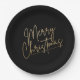 Merry Christmas text in chic fancy lettering in gold faux foil is featured on black holiday paper plates in two sizes. MATCHING items in our store.