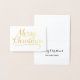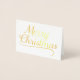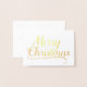 Pretty contemporary calligraphy typography word art on the front says "Merry Christmas" in gold foil against a white background.