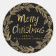 Chic, elegant and modern. Gold pine cone wreath surrounds Merry Christmas. Your family name is below.
