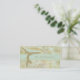 This is a really pretty business card for a gymnastics instructor or gym. It features a gold, mint green, and white abstract marbled background, with a matching light green name banner. The banner is thinly lined in shiny gold. Your custom text is in gold, also. A darker gold gymnast strikes a pose on the left side of the front. The back of the card has the same background, with a field for your information in grey. Striking!