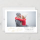 This simple gold save the date magnet features a large photo and modern calligraphy. Below a large landscape photo, "Save the Date" is written in gold script lettering against a crisp white background. To the right of the typography design, the couple's names, wedding date, and wedding location are written in a neutral grey.