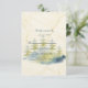 A gorgeous wedding invitation response card with a gold marble backdrop and green and blue spruce trees in the foreground.