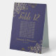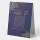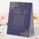 These elegant navy blue and gold table tent signs will make it easy for your guests to find their seats, and also make your wedding reception more beautiful. The feature a simple design with a lacy script calligraphy title with the table number and space for the names of 10 guests. Below is space for the names of the couple and the wedding date. The corners are decorated with lacy floral curls and swirls. Great way to add a touch of formal class to your reception.