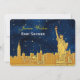Elegant, stylish, chic customisable invitations and accessories with the New York City skyline, featuring a stylised gold shaded ESB, Chrysler Building, Statue of Liberty and more, shown on a blue starry sky.